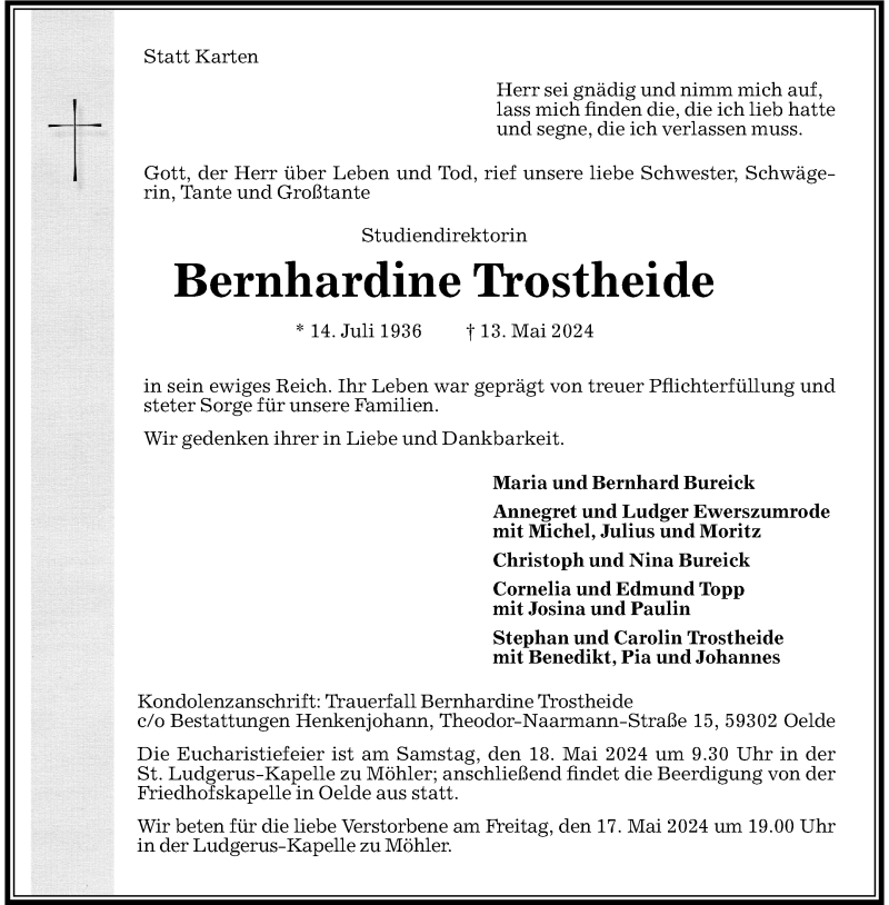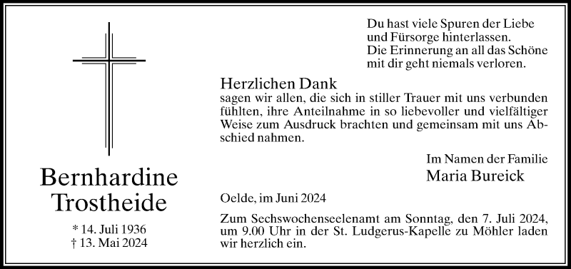 Hier finden Sie alle Traueranzeigen aus der Zeitung, die bisher für Bernhardine Trostheide erschienen sind. Weitere Traueranzeigen, die in der Zeitung erscheinen, werden hier ebenfalls aufgelistet