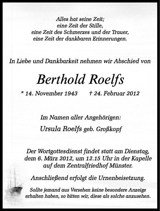 Hier finden Sie alle Traueranzeigen aus der Zeitung, die bisher für Berthold Roelfs erschienen sind. Weitere Traueranzeigen, die in der Zeitung erscheinen, werden hier ebenfalls aufgelistet