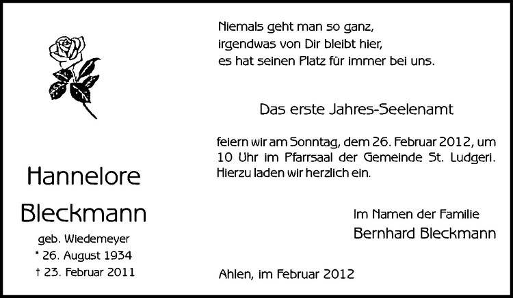 Hier finden Sie alle Traueranzeigen aus der Zeitung, die bisher für Bleckmann Hannelore erschienen sind. Weitere Traueranzeigen, die in der Zeitung erscheinen, werden hier ebenfalls aufgelistet