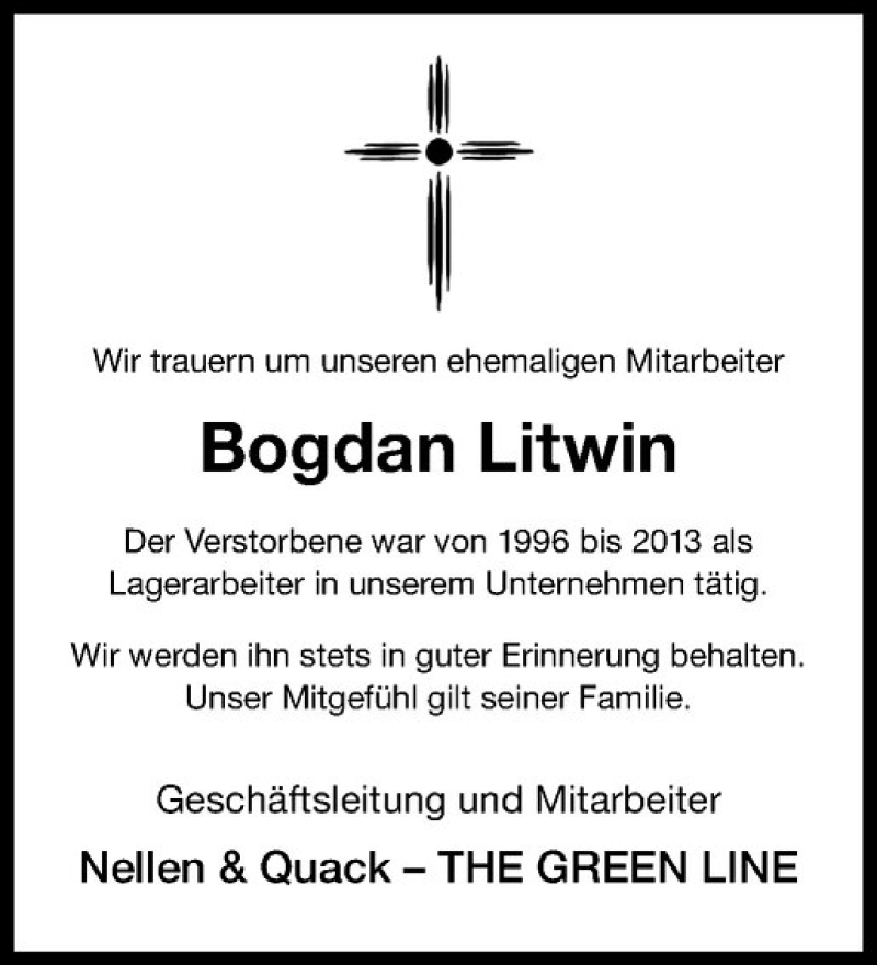 Hier finden Sie alle Traueranzeigen aus der Zeitung, die bisher für Bogdan Litwin erschienen sind. Weitere Traueranzeigen, die in der Zeitung erscheinen, werden hier ebenfalls aufgelistet