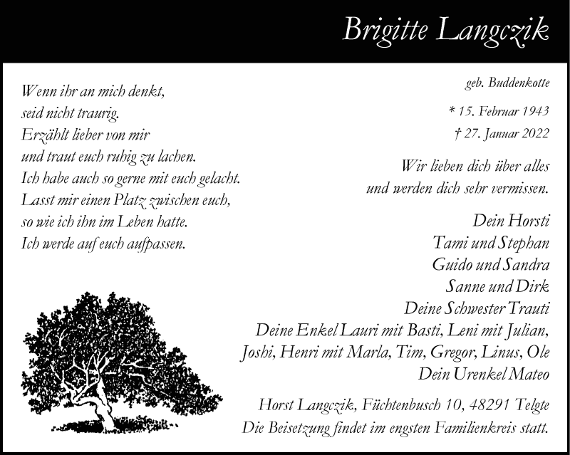 Hier finden Sie alle Traueranzeigen aus der Zeitung, die bisher für Brigitte Langczik erschienen sind. Weitere Traueranzeigen, die in der Zeitung erscheinen, werden hier ebenfalls aufgelistet