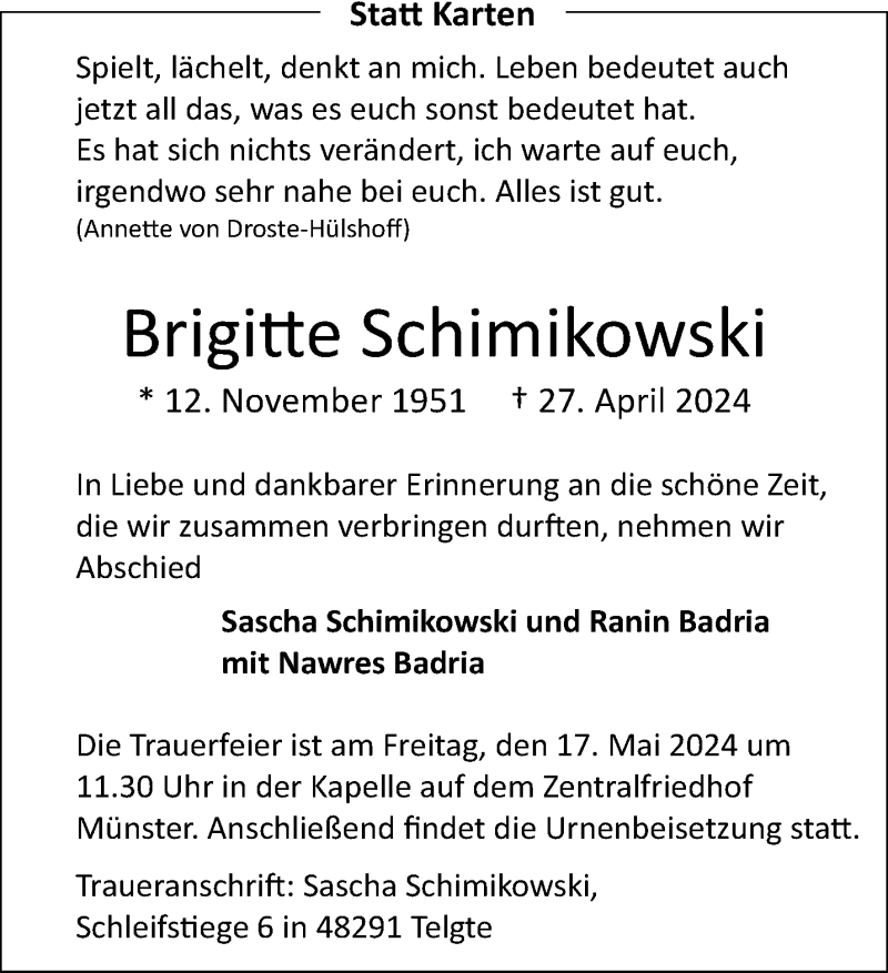 Hier finden Sie alle Traueranzeigen aus der Zeitung, die bisher für Brigitte Schimikowski erschienen sind. Weitere Traueranzeigen, die in der Zeitung erscheinen, werden hier ebenfalls aufgelistet