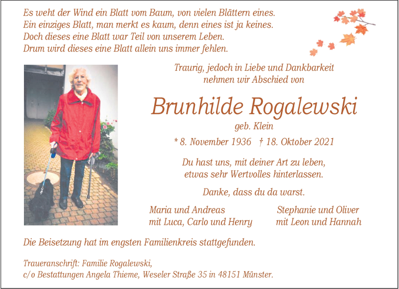 Hier finden Sie alle Traueranzeigen aus der Zeitung, die bisher für Brunhilde Rogalewski erschienen sind. Weitere Traueranzeigen, die in der Zeitung erscheinen, werden hier ebenfalls aufgelistet