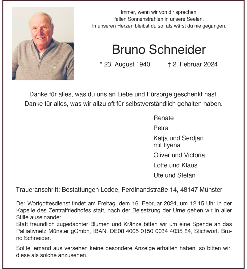 Hier finden Sie alle Traueranzeigen aus der Zeitung, die bisher für Bruno Schneider erschienen sind. Weitere Traueranzeigen, die in der Zeitung erscheinen, werden hier ebenfalls aufgelistet