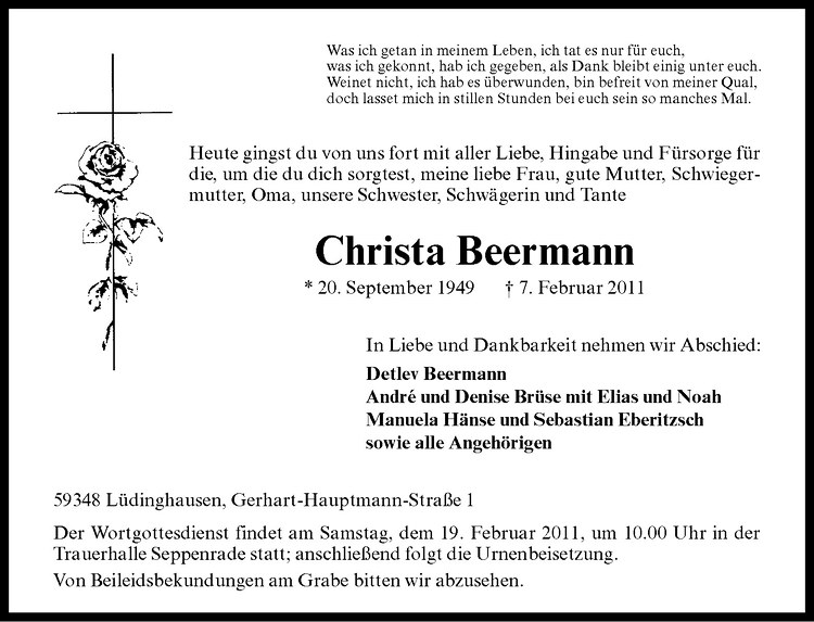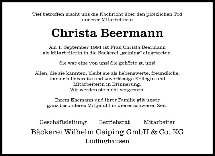 Hier finden Sie alle Traueranzeigen aus der Zeitung, die bisher für Christa Beermann erschienen sind. Weitere Traueranzeigen, die in der Zeitung erscheinen, werden hier ebenfalls aufgelistet