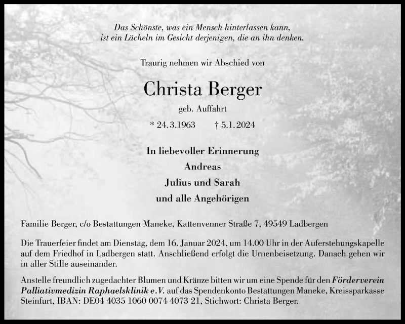 Hier finden Sie alle Traueranzeigen aus der Zeitung, die bisher für Christa Berger erschienen sind. Weitere Traueranzeigen, die in der Zeitung erscheinen, werden hier ebenfalls aufgelistet