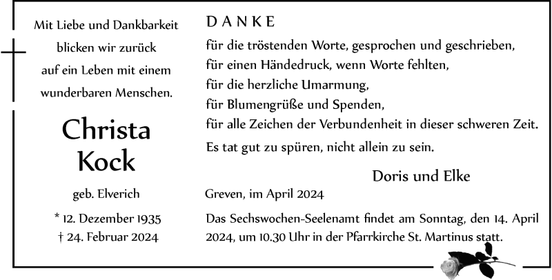 Hier finden Sie alle Traueranzeigen aus der Zeitung, die bisher für Christa Kock erschienen sind. Weitere Traueranzeigen, die in der Zeitung erscheinen, werden hier ebenfalls aufgelistet