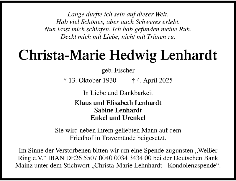 Hier finden Sie alle Traueranzeigen aus der Zeitung, die bisher für Christa-Marie Hedwig Lenhardt erschienen sind. Weitere Traueranzeigen, die in der Zeitung erscheinen, werden hier ebenfalls aufgelistet