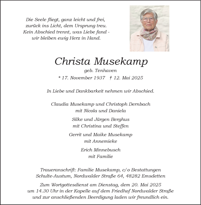 Hier finden Sie alle Traueranzeigen aus der Zeitung, die bisher für Christa Musekamp erschienen sind. Weitere Traueranzeigen, die in der Zeitung erscheinen, werden hier ebenfalls aufgelistet