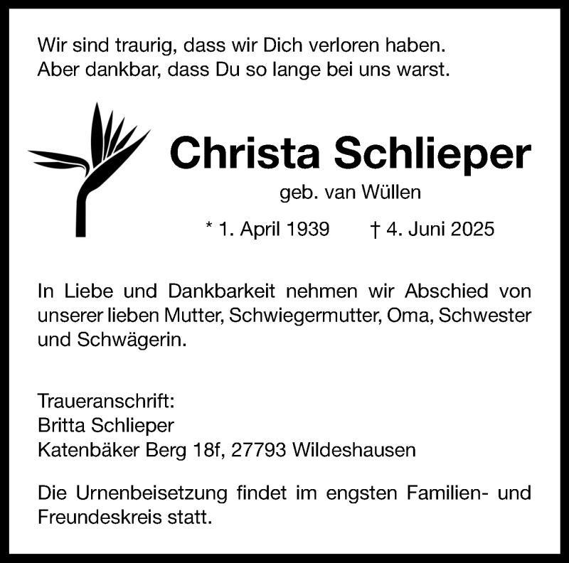 Hier finden Sie alle Traueranzeigen aus der Zeitung, die bisher für Christa Schlieper erschienen sind. Weitere Traueranzeigen, die in der Zeitung erscheinen, werden hier ebenfalls aufgelistet