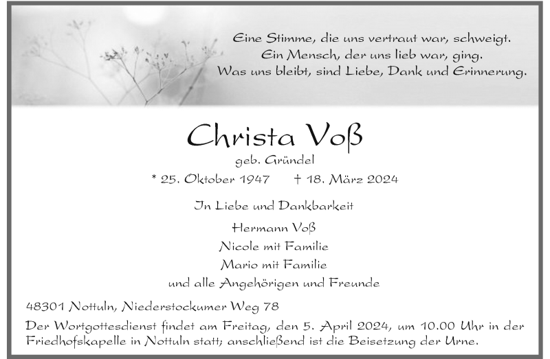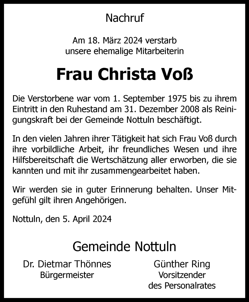 Hier finden Sie alle Traueranzeigen aus der Zeitung, die bisher für Christa Voß erschienen sind. Weitere Traueranzeigen, die in der Zeitung erscheinen, werden hier ebenfalls aufgelistet