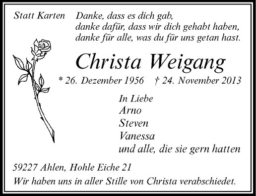 Hier finden Sie alle Traueranzeigen aus der Zeitung, die bisher für Christa Weigang erschienen sind. Weitere Traueranzeigen, die in der Zeitung erscheinen, werden hier ebenfalls aufgelistet