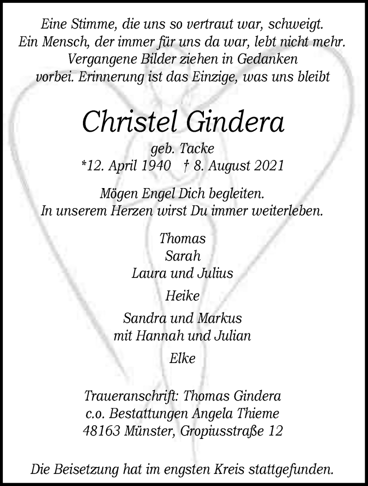 Hier finden Sie alle Traueranzeigen aus der Zeitung, die bisher für Christel Gindera erschienen sind. Weitere Traueranzeigen, die in der Zeitung erscheinen, werden hier ebenfalls aufgelistet
