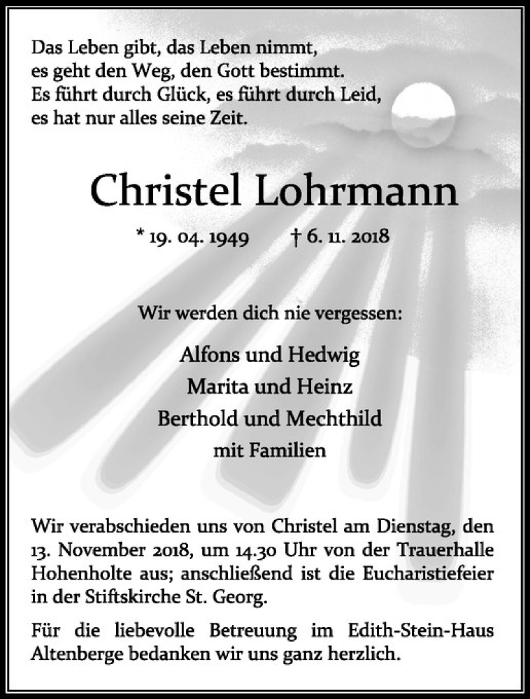 Hier finden Sie alle Traueranzeigen aus der Zeitung, die bisher für Christel Lohrmann erschienen sind. Weitere Traueranzeigen, die in der Zeitung erscheinen, werden hier ebenfalls aufgelistet