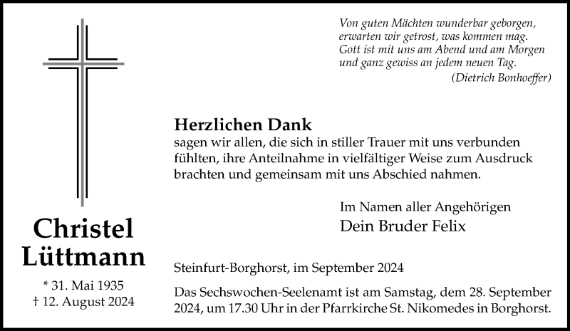 Hier finden Sie alle Traueranzeigen aus der Zeitung, die bisher für Christel Lüttmann erschienen sind. Weitere Traueranzeigen, die in der Zeitung erscheinen, werden hier ebenfalls aufgelistet