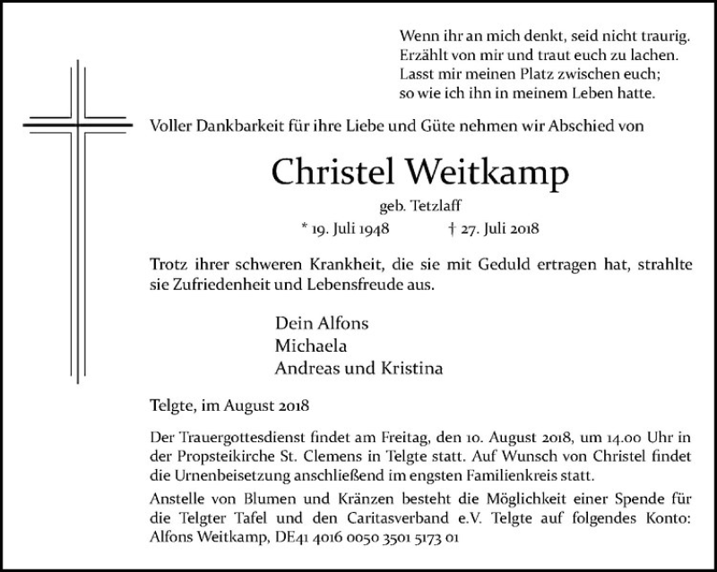Hier finden Sie alle Traueranzeigen aus der Zeitung, die bisher für Christel Weitkamp erschienen sind. Weitere Traueranzeigen, die in der Zeitung erscheinen, werden hier ebenfalls aufgelistet