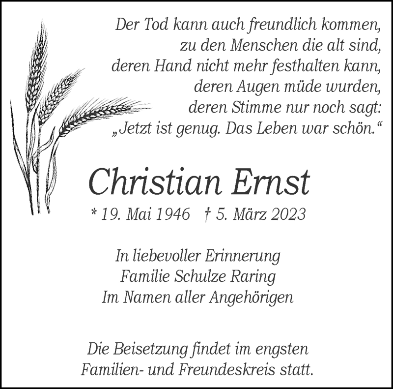 Hier finden Sie alle Traueranzeigen aus der Zeitung, die bisher für Christian Ernst erschienen sind. Weitere Traueranzeigen, die in der Zeitung erscheinen, werden hier ebenfalls aufgelistet