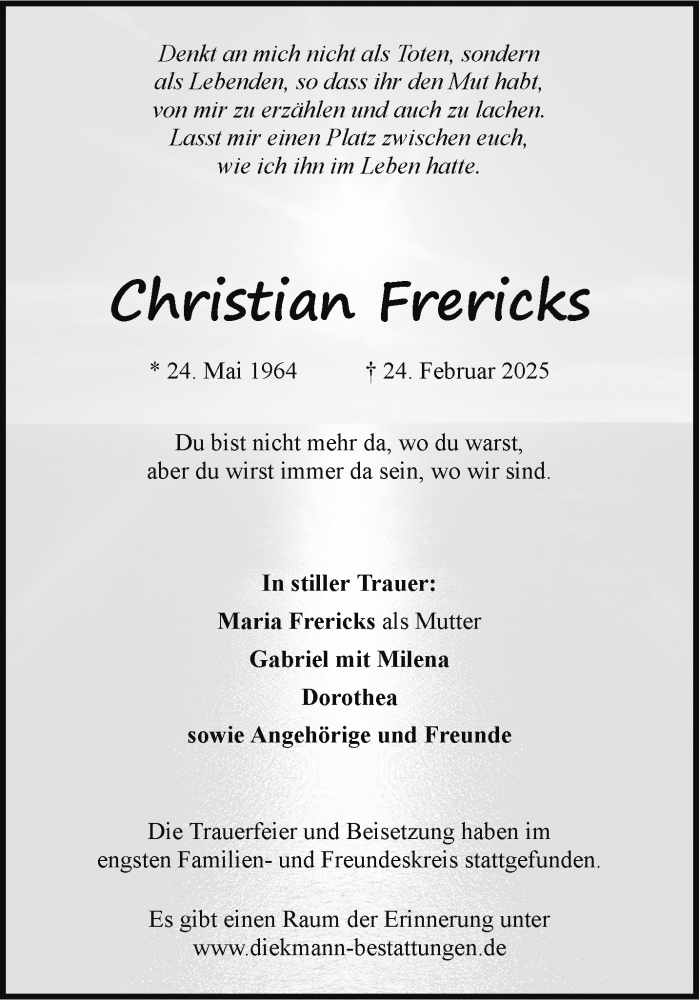 Hier finden Sie alle Traueranzeigen aus der Zeitung, die bisher für Christian Frericks erschienen sind. Weitere Traueranzeigen, die in der Zeitung erscheinen, werden hier ebenfalls aufgelistet