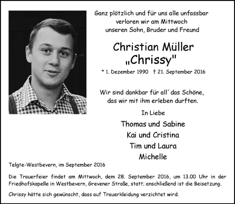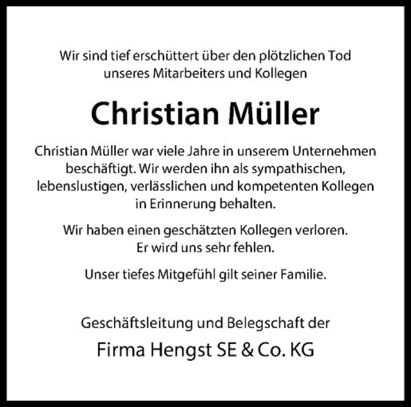 Hier finden Sie alle Traueranzeigen aus der Zeitung, die bisher für Christian Müller erschienen sind. Weitere Traueranzeigen, die in der Zeitung erscheinen, werden hier ebenfalls aufgelistet