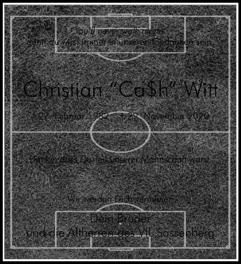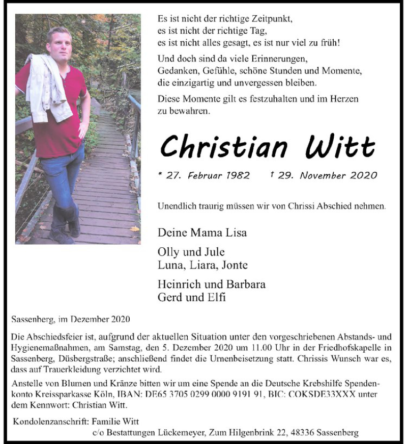 Hier finden Sie alle Traueranzeigen aus der Zeitung, die bisher für Christian Witt erschienen sind. Weitere Traueranzeigen, die in der Zeitung erscheinen, werden hier ebenfalls aufgelistet