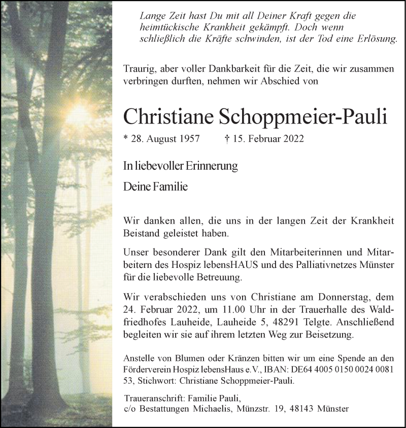 Hier finden Sie alle Traueranzeigen aus der Zeitung, die bisher für Christiane Schoppmeier-Pauli erschienen sind. Weitere Traueranzeigen, die in der Zeitung erscheinen, werden hier ebenfalls aufgelistet