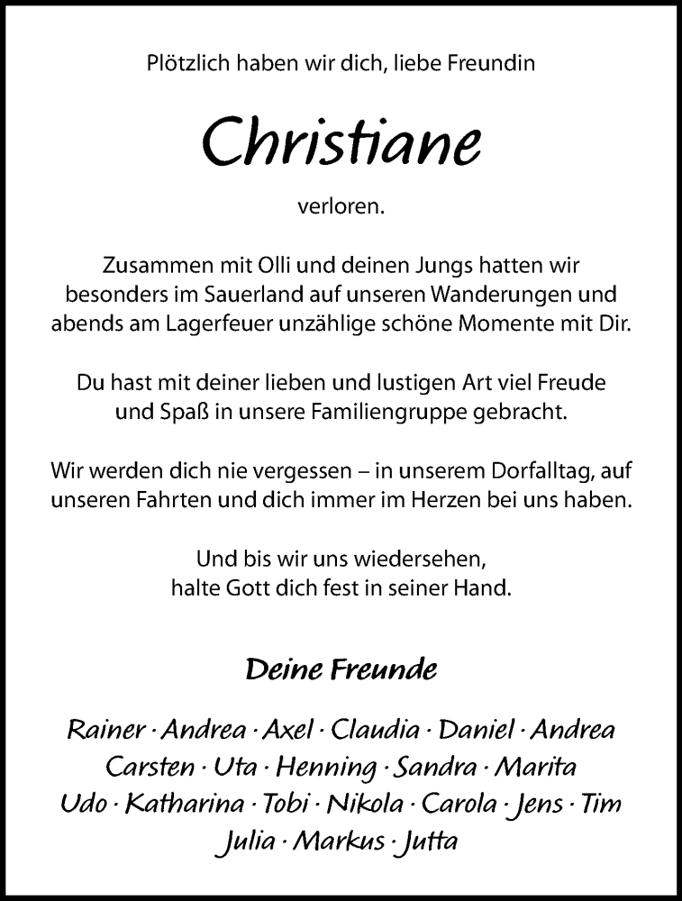 Hier finden Sie alle Traueranzeigen aus der Zeitung, die bisher für Christiane Tack erschienen sind. Weitere Traueranzeigen, die in der Zeitung erscheinen, werden hier ebenfalls aufgelistet
