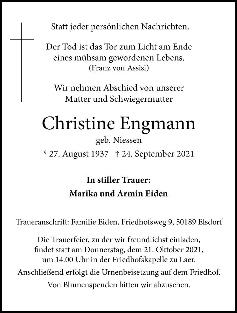 Hier finden Sie alle Traueranzeigen aus der Zeitung, die bisher für Christine Engmann erschienen sind. Weitere Traueranzeigen, die in der Zeitung erscheinen, werden hier ebenfalls aufgelistet