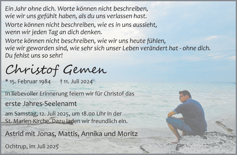 Hier finden Sie alle Traueranzeigen aus der Zeitung, die bisher für Christof Gemen erschienen sind. Weitere Traueranzeigen, die in der Zeitung erscheinen, werden hier ebenfalls aufgelistet