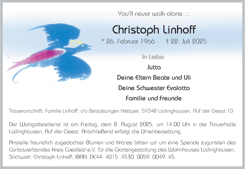 Hier finden Sie alle Traueranzeigen aus der Zeitung, die bisher für Christoph Linhhoff erschienen sind. Weitere Traueranzeigen, die in der Zeitung erscheinen, werden hier ebenfalls aufgelistet
