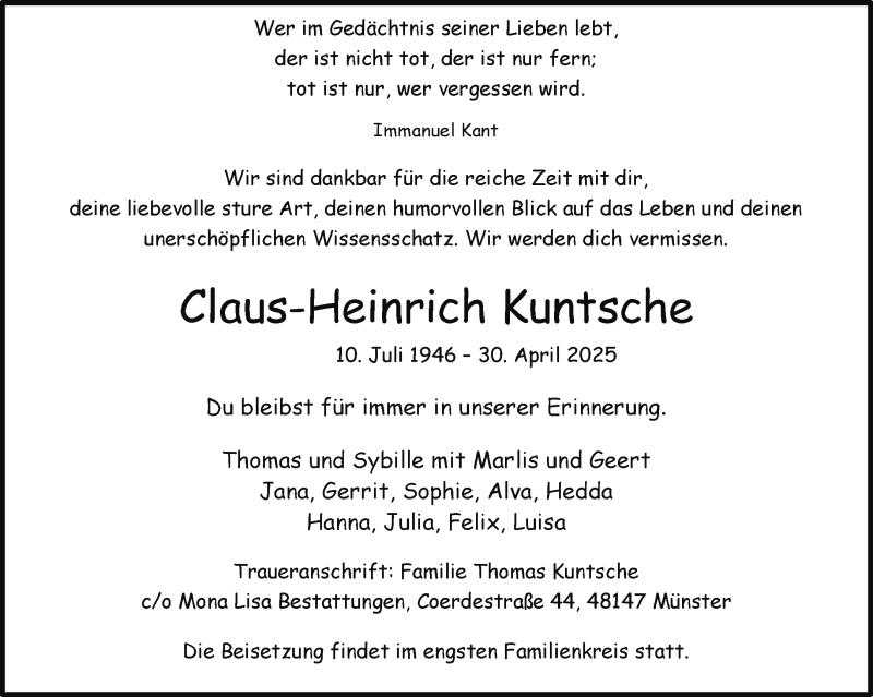 Hier finden Sie alle Traueranzeigen aus der Zeitung, die bisher für Claus-Heinrich Kuntsche erschienen sind. Weitere Traueranzeigen, die in der Zeitung erscheinen, werden hier ebenfalls aufgelistet