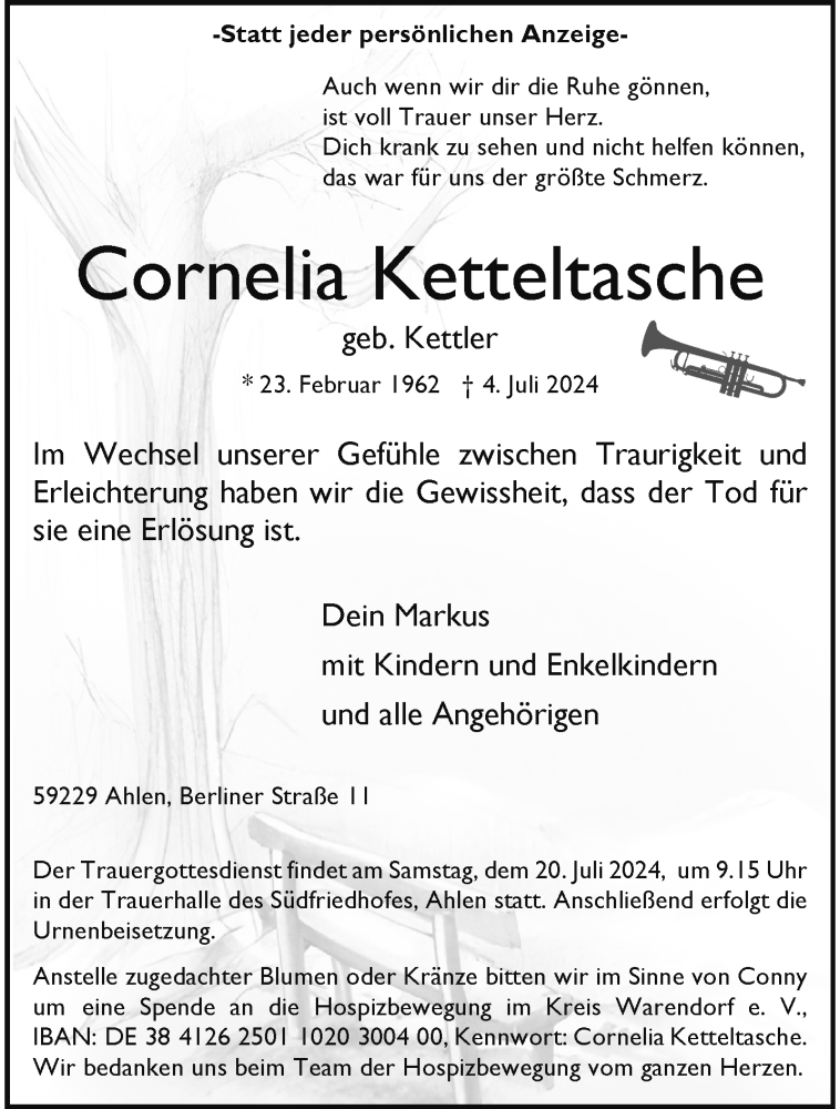 Hier finden Sie alle Traueranzeigen aus der Zeitung, die bisher für Cornelia Ketteltasche erschienen sind. Weitere Traueranzeigen, die in der Zeitung erscheinen, werden hier ebenfalls aufgelistet
