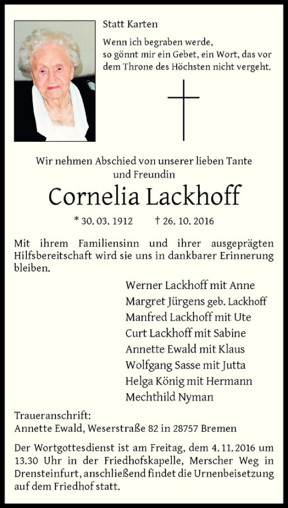 Hier finden Sie alle Traueranzeigen aus der Zeitung, die bisher für Cornelia Lackhoff erschienen sind. Weitere Traueranzeigen, die in der Zeitung erscheinen, werden hier ebenfalls aufgelistet