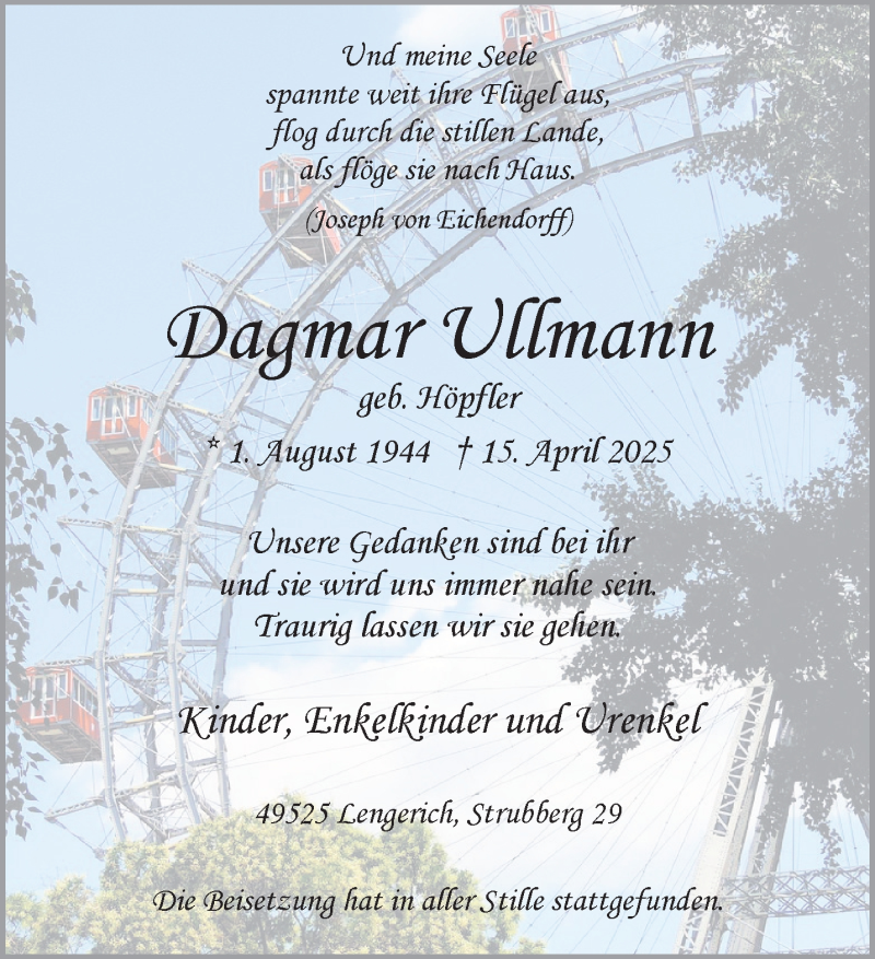 Hier finden Sie alle Traueranzeigen aus der Zeitung, die bisher für Dagmar Ullmann erschienen sind. Weitere Traueranzeigen, die in der Zeitung erscheinen, werden hier ebenfalls aufgelistet