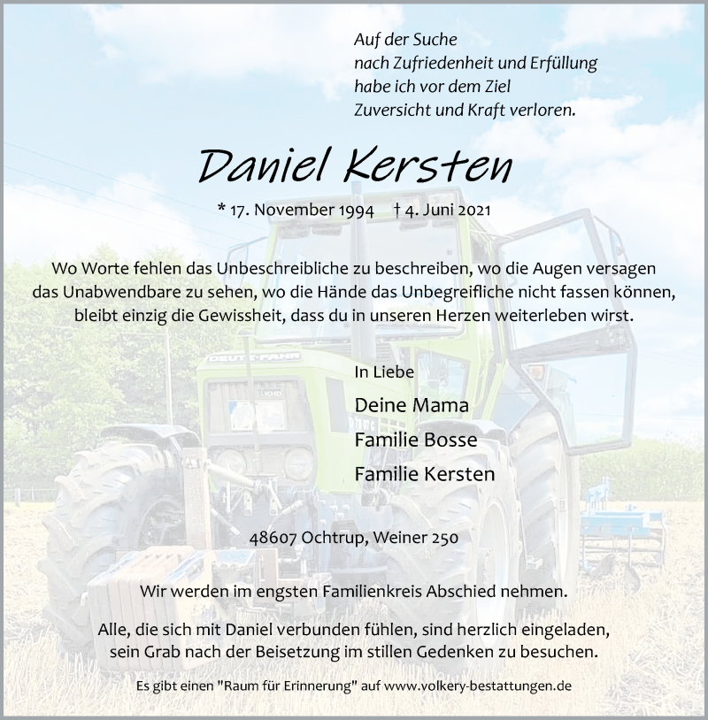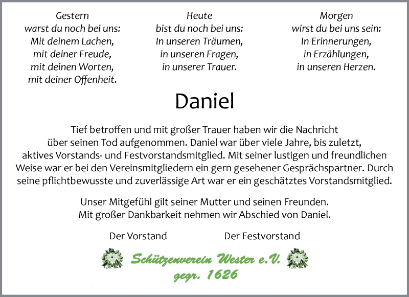 Hier finden Sie alle Traueranzeigen aus der Zeitung, die bisher für Daniel Kersten erschienen sind. Weitere Traueranzeigen, die in der Zeitung erscheinen, werden hier ebenfalls aufgelistet