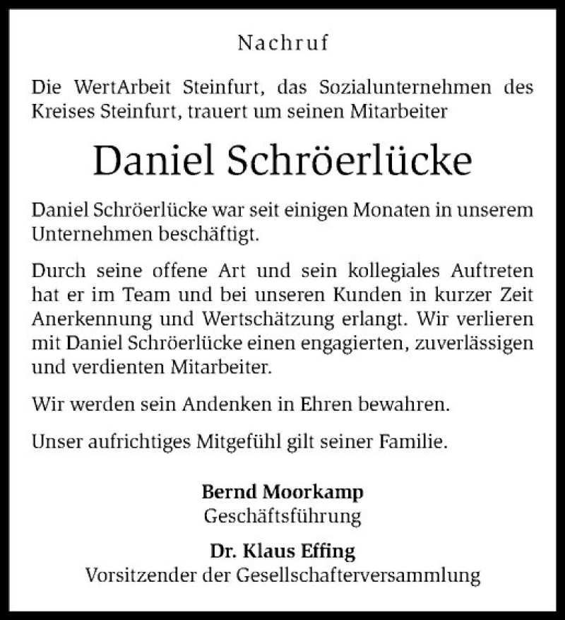 Hier finden Sie alle Traueranzeigen aus der Zeitung, die bisher für Daniel Schröerlücke erschienen sind. Weitere Traueranzeigen, die in der Zeitung erscheinen, werden hier ebenfalls aufgelistet