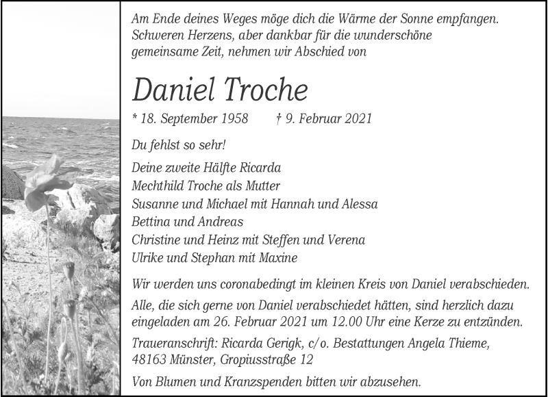 Hier finden Sie alle Traueranzeigen aus der Zeitung, die bisher für Daniel Troche erschienen sind. Weitere Traueranzeigen, die in der Zeitung erscheinen, werden hier ebenfalls aufgelistet