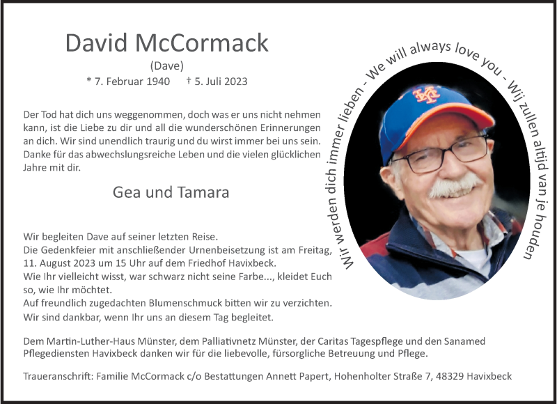 Hier finden Sie alle Traueranzeigen aus der Zeitung, die bisher für David McCormack erschienen sind. Weitere Traueranzeigen, die in der Zeitung erscheinen, werden hier ebenfalls aufgelistet