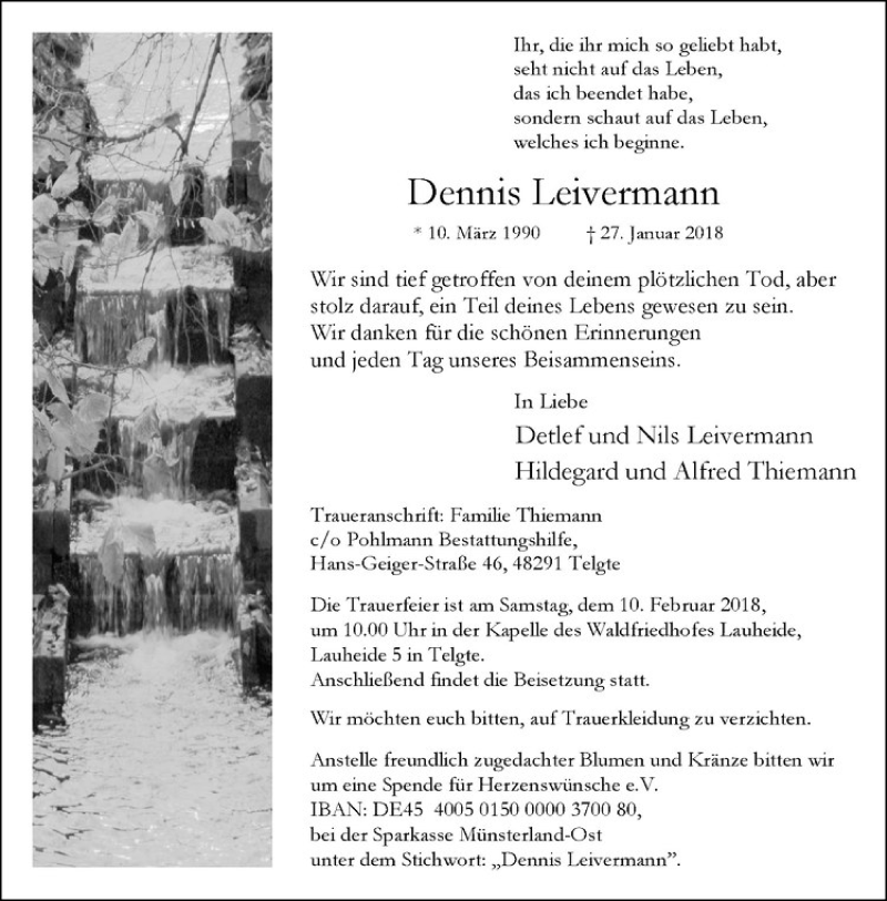 Hier finden Sie alle Traueranzeigen aus der Zeitung, die bisher für Dennis Leivermann erschienen sind. Weitere Traueranzeigen, die in der Zeitung erscheinen, werden hier ebenfalls aufgelistet