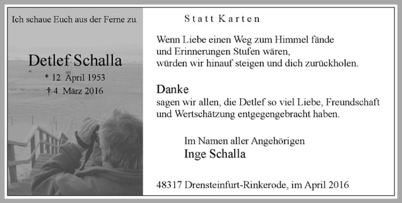Hier finden Sie alle Traueranzeigen aus der Zeitung, die bisher für Detlef Schalla erschienen sind. Weitere Traueranzeigen, die in der Zeitung erscheinen, werden hier ebenfalls aufgelistet