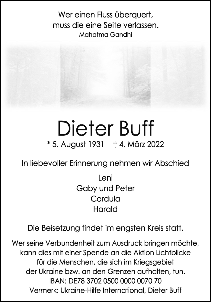 Hier finden Sie alle Traueranzeigen aus der Zeitung, die bisher für Dieter Buff erschienen sind. Weitere Traueranzeigen, die in der Zeitung erscheinen, werden hier ebenfalls aufgelistet