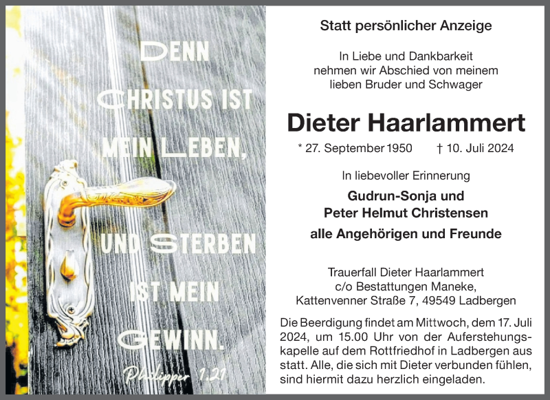 Hier finden Sie alle Traueranzeigen aus der Zeitung, die bisher für Dieter Haarlammert erschienen sind. Weitere Traueranzeigen, die in der Zeitung erscheinen, werden hier ebenfalls aufgelistet