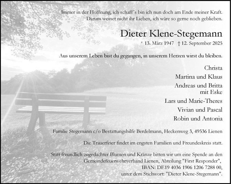 Hier finden Sie alle Traueranzeigen aus der Zeitung, die bisher für Dieter Klene-Stegemann erschienen sind. Weitere Traueranzeigen, die in der Zeitung erscheinen, werden hier ebenfalls aufgelistet