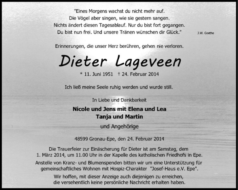 Hier finden Sie alle Traueranzeigen aus der Zeitung, die bisher für Dieter Lageveen erschienen sind. Weitere Traueranzeigen, die in der Zeitung erscheinen, werden hier ebenfalls aufgelistet
