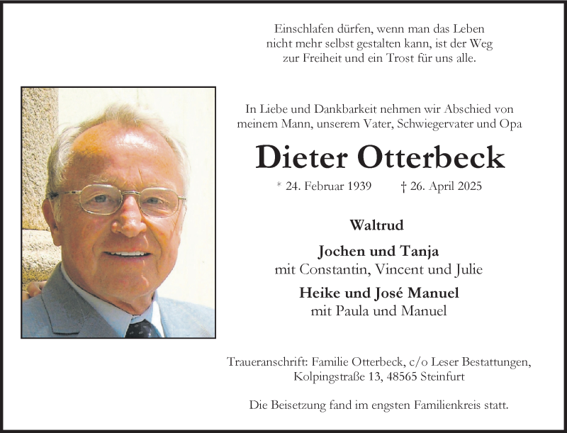 Hier finden Sie alle Traueranzeigen aus der Zeitung, die bisher für Dieter Otterbeck erschienen sind. Weitere Traueranzeigen, die in der Zeitung erscheinen, werden hier ebenfalls aufgelistet