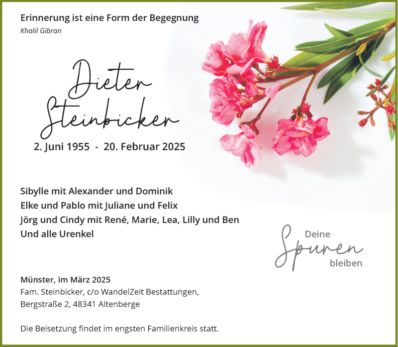 Hier finden Sie alle Traueranzeigen aus der Zeitung, die bisher für Dieter Steinbicker erschienen sind. Weitere Traueranzeigen, die in der Zeitung erscheinen, werden hier ebenfalls aufgelistet