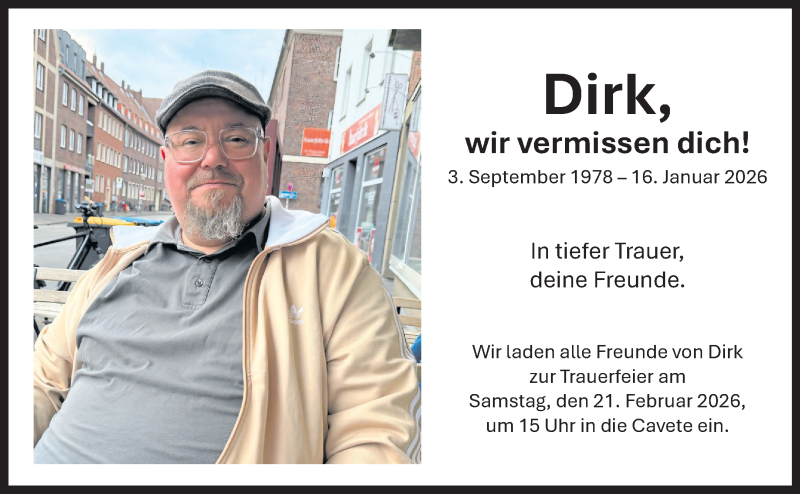 Hier finden Sie alle Traueranzeigen aus der Zeitung, die bisher für Dirk erschienen sind. Weitere Traueranzeigen, die in der Zeitung erscheinen, werden hier ebenfalls aufgelistet