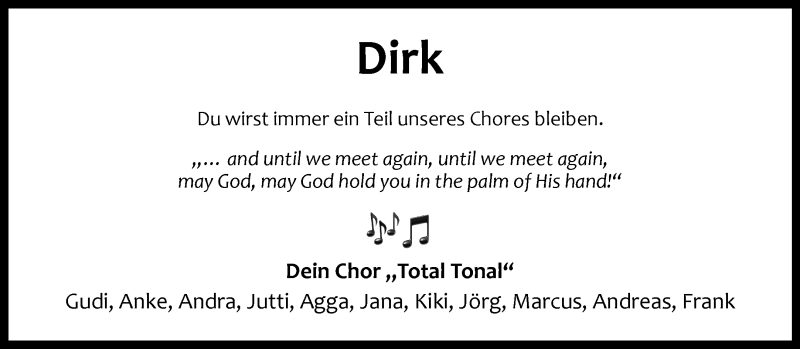 Hier finden Sie alle Traueranzeigen aus der Zeitung, die bisher für Dirk Eierhoff erschienen sind. Weitere Traueranzeigen, die in der Zeitung erscheinen, werden hier ebenfalls aufgelistet