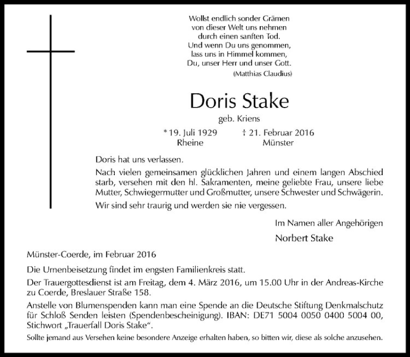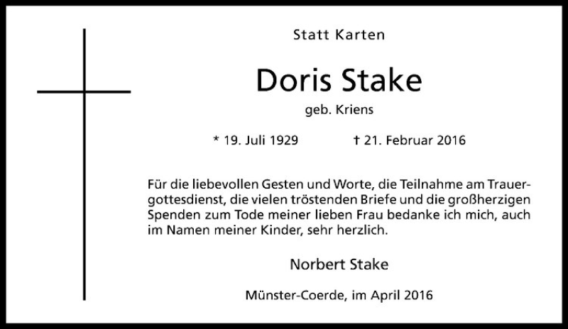 Hier finden Sie alle Traueranzeigen aus der Zeitung, die bisher für Doris Stake erschienen sind. Weitere Traueranzeigen, die in der Zeitung erscheinen, werden hier ebenfalls aufgelistet