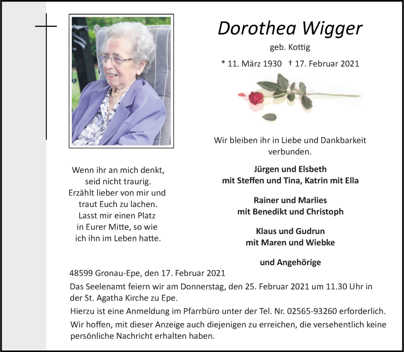 Hier finden Sie alle Traueranzeigen aus der Zeitung, die bisher für Dorothea Wigger erschienen sind. Weitere Traueranzeigen, die in der Zeitung erscheinen, werden hier ebenfalls aufgelistet