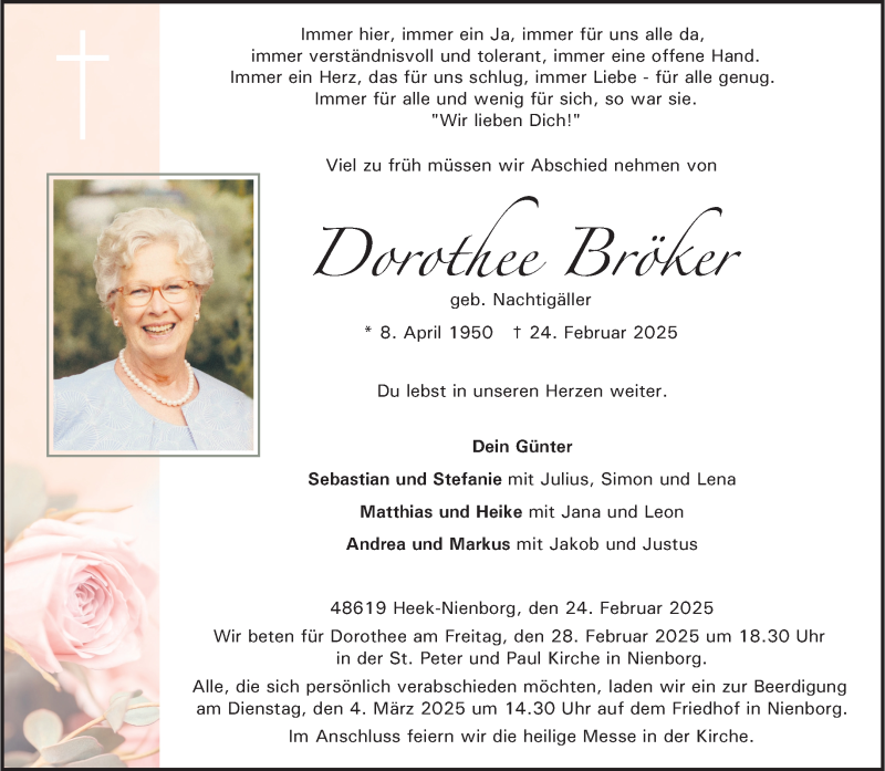 Hier finden Sie alle Traueranzeigen aus der Zeitung, die bisher für Dorothee Bröker erschienen sind. Weitere Traueranzeigen, die in der Zeitung erscheinen, werden hier ebenfalls aufgelistet